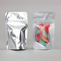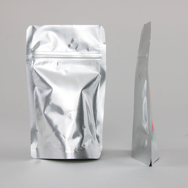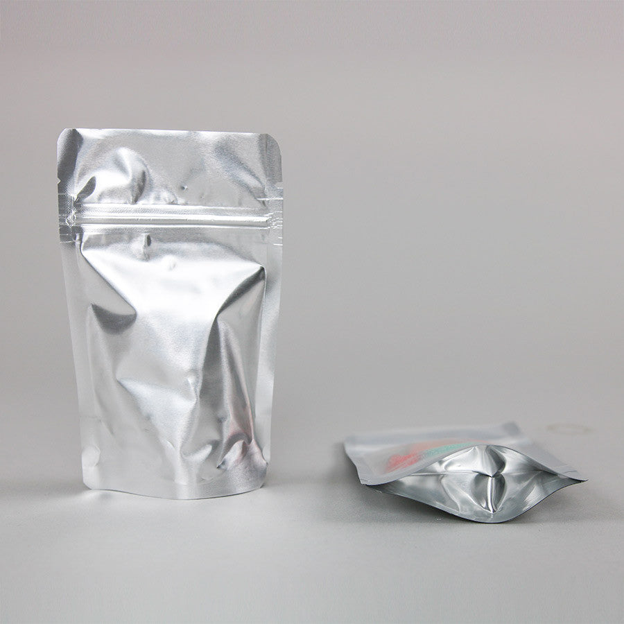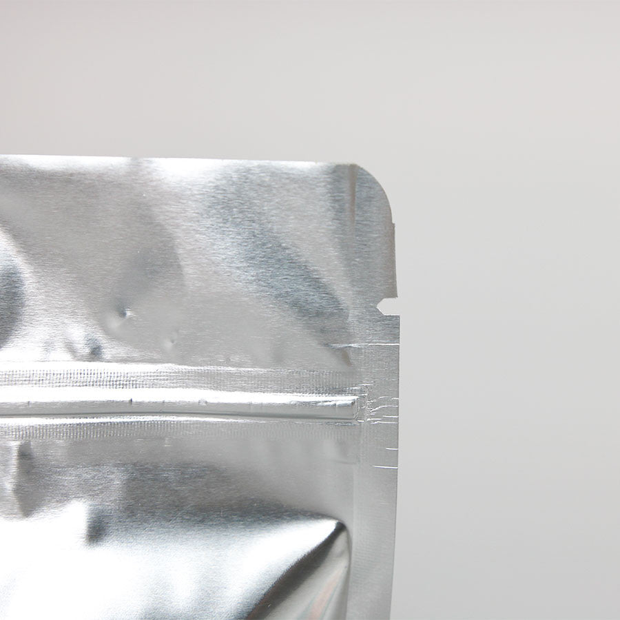 3.125" x 5.0" x 2.0" Clear/Silver Stand Up Pouch with ZipSeal, tear notch and rounded corners;