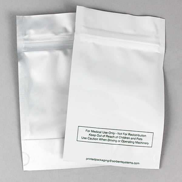 4.0" x 6.41" x 2.25" OD Clear/White stand up medical bag, disclaimer on white side; Stand Up Pouch open on the ZipSeal end with NO tear notch; 1/4 oz bag (1,000/case) Disclaimer printed on white side,...