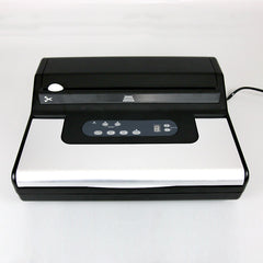 The all-in-one sealing system: includes a built-in roll dispenser with cutter, and built in vacuum hose with storage compartment (hose and adapter included). Seals textured vacuum bags up to 12.2” wide. Easy snap close and seal operation with digital display and adjustable vacuum and seal time. Special design prevents liquid from entering pump, and removable sauce tray makes clean up easy.
