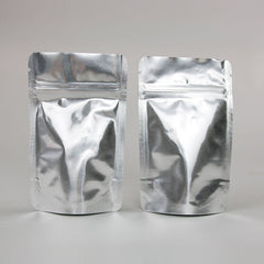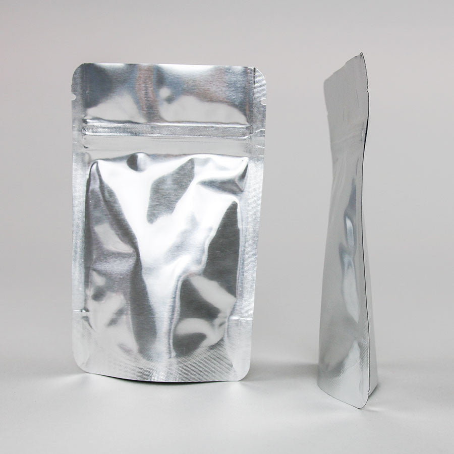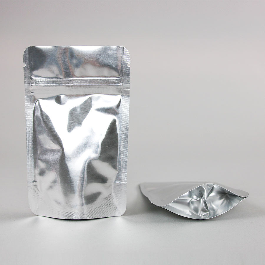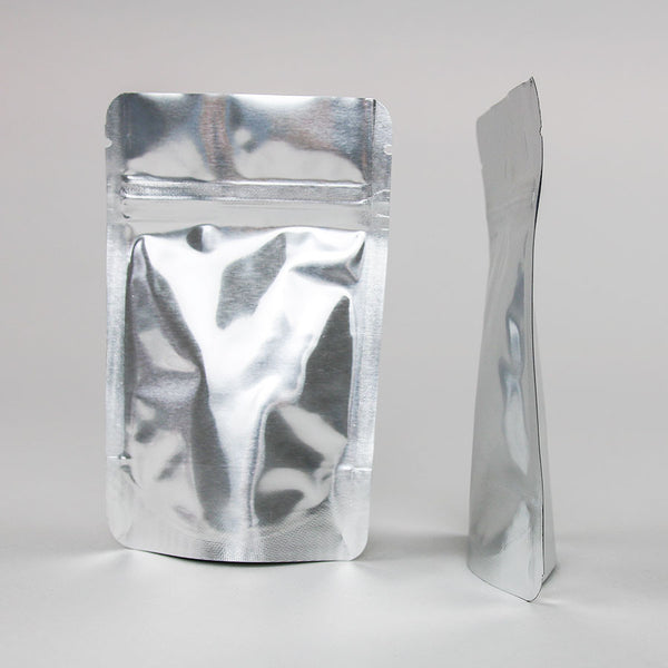 3.125" x 5.0" x 2.0" Silver/Silver Stand Up Pouch with ZipSeal, rounded corners and tear notch;