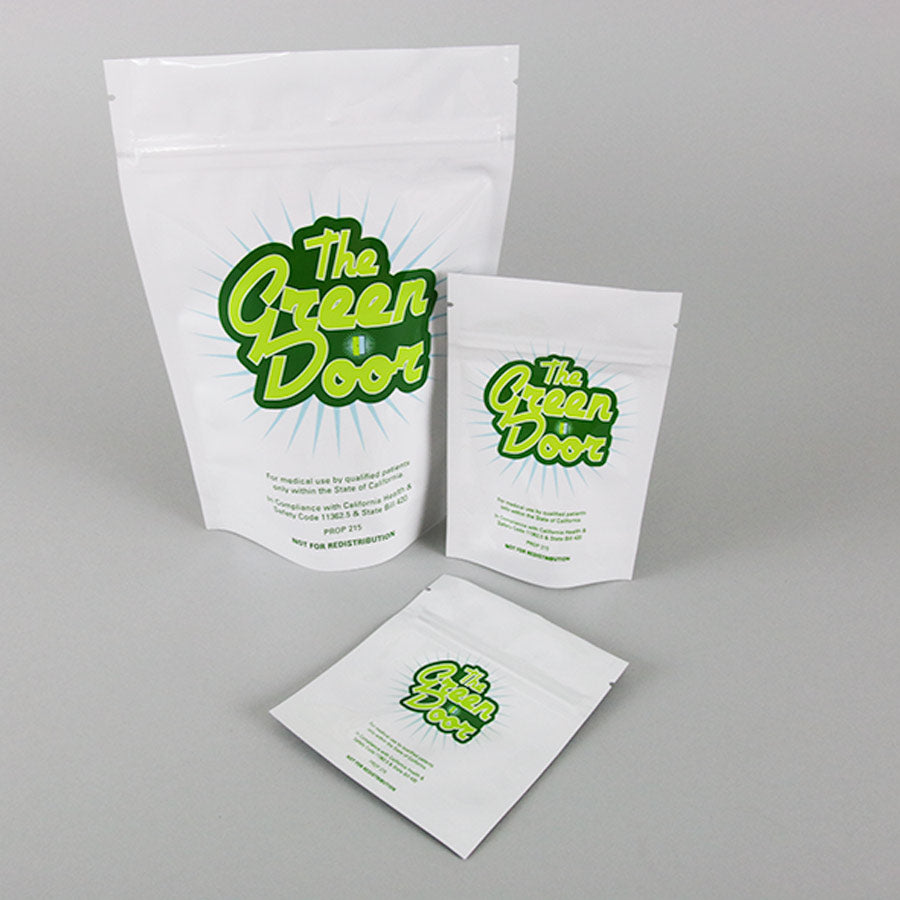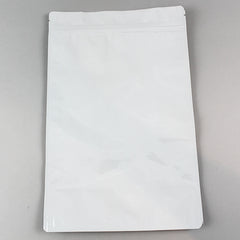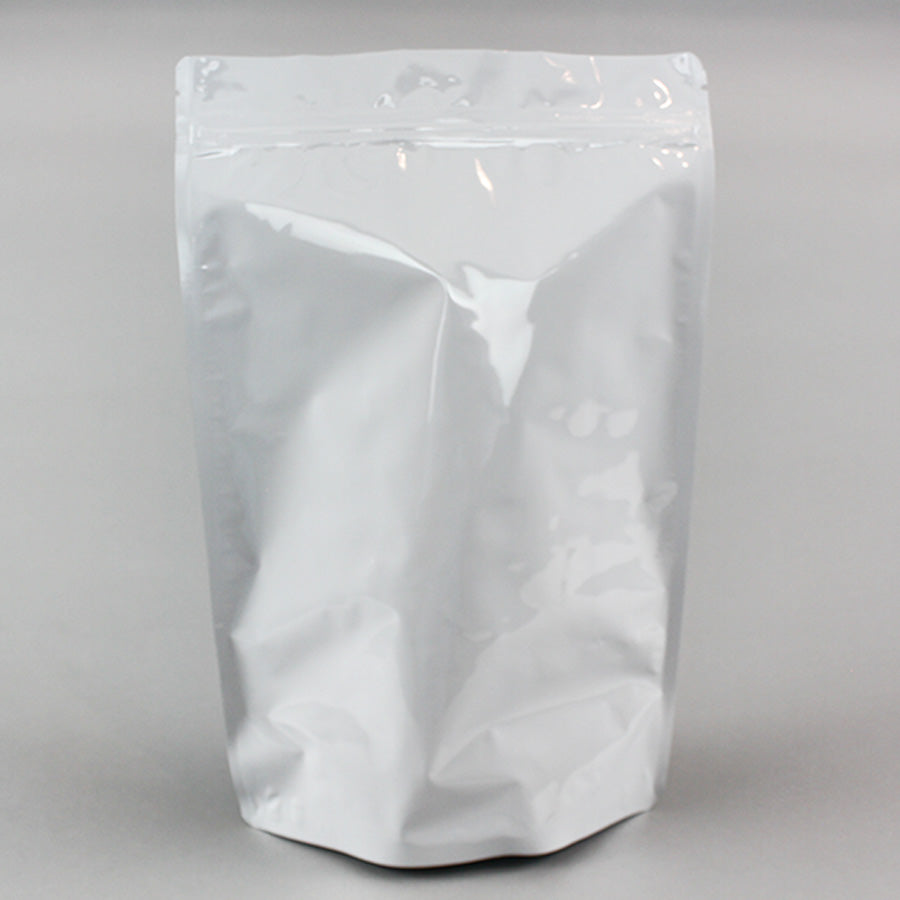7.625" x 11.75" x 4.0" White/White Stand Up Pouch with ZipSeal and tear notch;