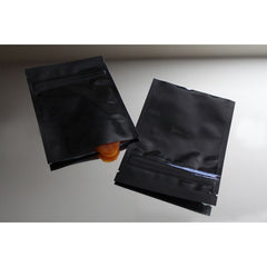 3.4" X 5.25" Black 3 side seal tamper evident pouch with zipper 1.125" from sealed end and and tear notch 0.75" from sealed end;