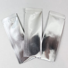 1.4” x 4.0” OD 4.0 Mil Silver StickPak Pouch with one tear notch and fold over side;