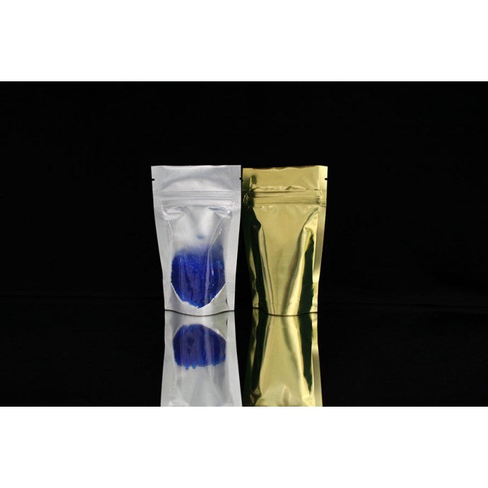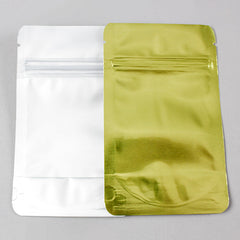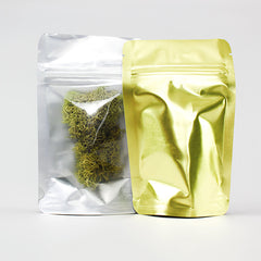 3.125" x 5.0" x 2.0" Clear/Gold Stand Up Pouch with ZipSeal and tear notch; Round Corners Fits 1/8th = 3.5 grams of flowers 1,000/case